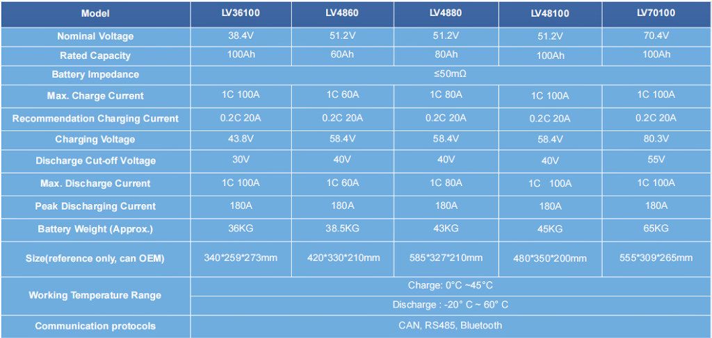 The advantages of our lithium-ion batteries include lighterweight, shorter charging time, longer lifespan, maintenance-free, and significant savings in electricity costs for you. Our batteries also come with an integrated management system, which includes switches and a state of charge (SOC) indicator.